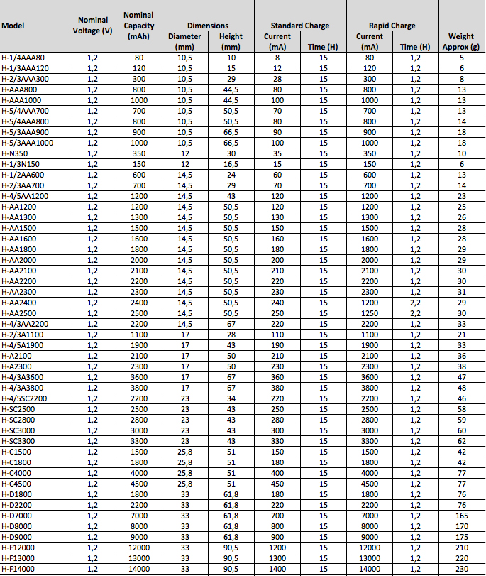 NiMH batteries come in all the standard sizes including AA, AAA, C, D, and 9V, as well as some specialty sizes including A, 2/3A, 4/3A, and more.